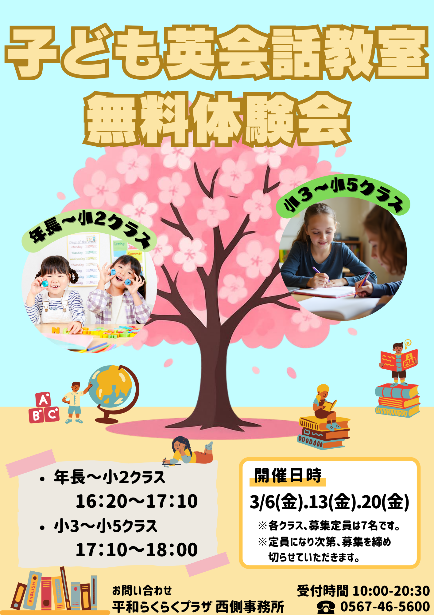 3/6(金).13(金).20(金)に子供英会話教室の無料体験会を行います。英語は早めのスタートが自信につながります!お子様の年齢に合わせたクラスで楽しく・しっかり学べるレッスンをご用意しております。実際の教室の様子を体験できるチャンスです!詳しくは西側事務所にお問い合わせください。