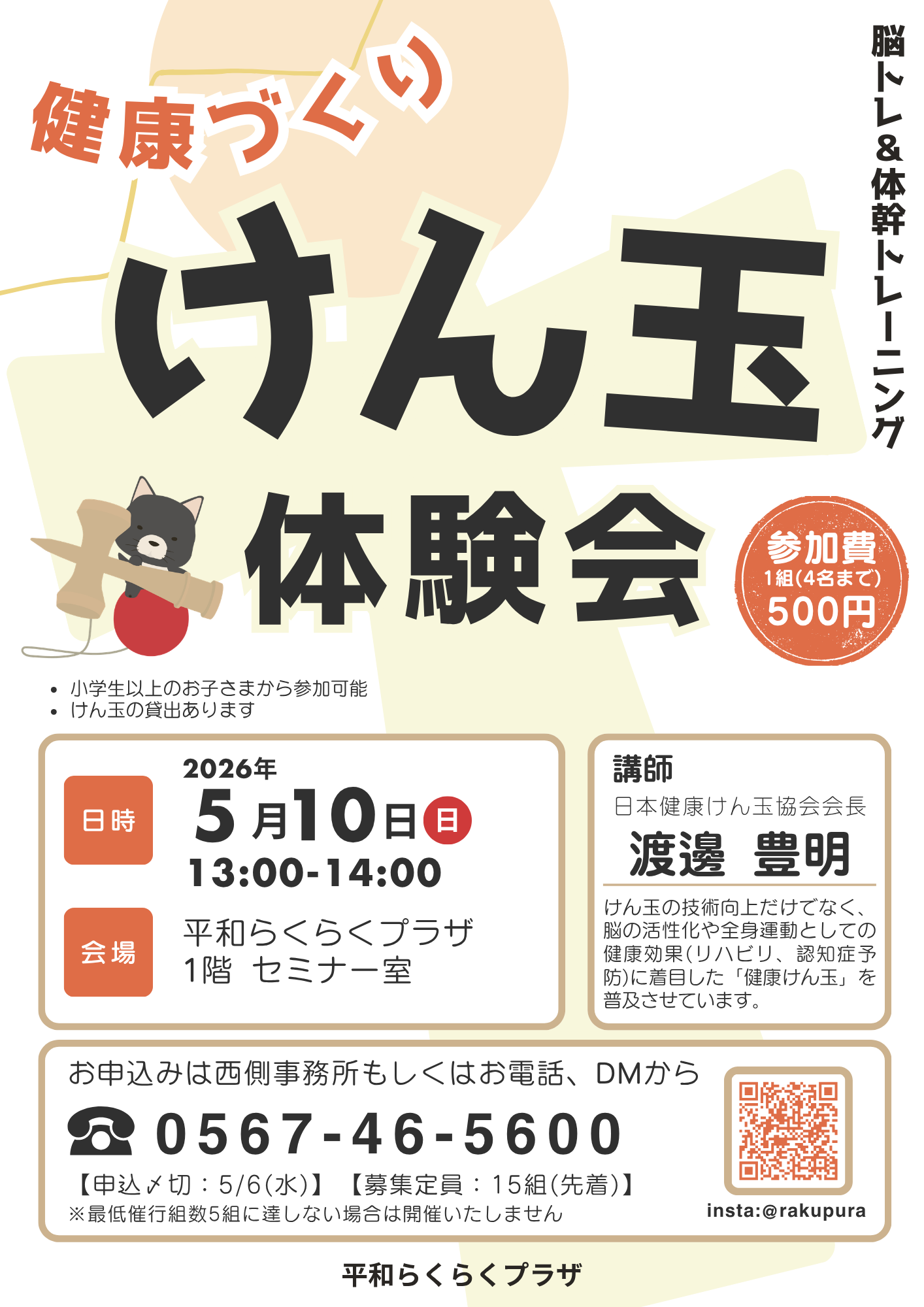 5/10(日)に健康づくりけん玉体験会を開催いたします。講師に日本健康けん玉協会会長の渡邊豊明をお迎えします!年配の方には体幹トレーニングに、子供たちには集中力UPに効果的です!1組4名様まで参加可能!小学生未満の幼児の子も一緒に見に来ることも可能です。お持ちのけん玉を持参していただいても構いません。けん玉の貸し出しもありますのでご利用ください!