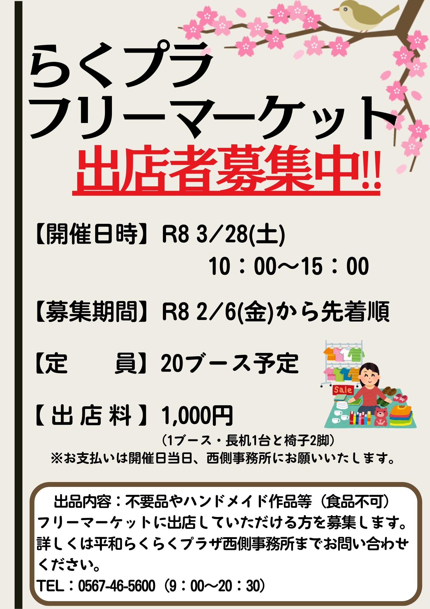 3/28(土)に開催のフリーマーケットに出店いていただける方を募集いたします。募集期間は2/6(金)から先着順となります。詳しくは西側事務所までお問い合わせください。たくさんのご参加お待ちしております!