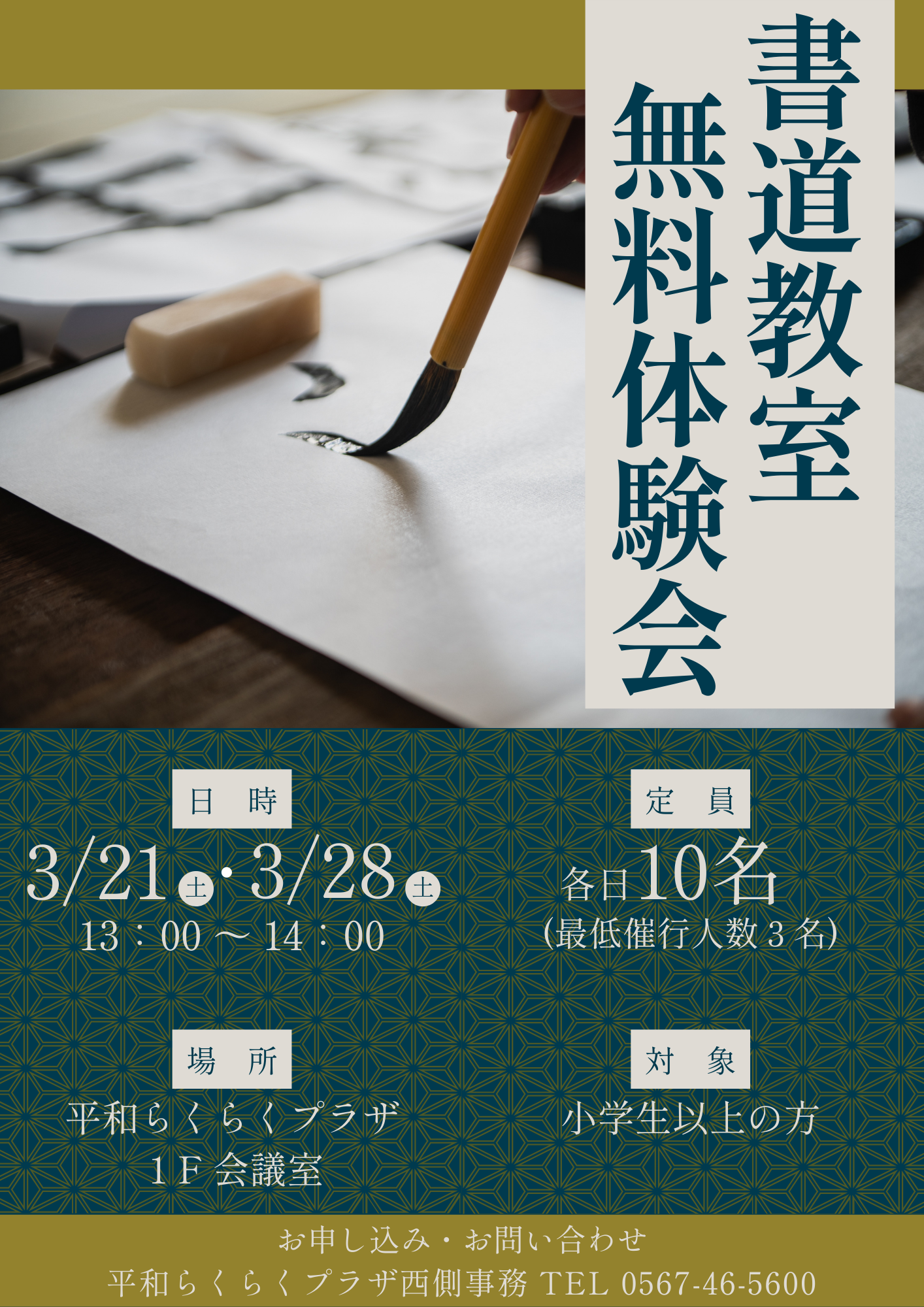 R8.4月開講予定の書道教室に先駆けて、無料体験会を開催いたします。小学生以上の方ならどなたでもご参加可能です。定員は各日10名です。最低催行人数に達しない場合は、開講いたしませんので、予めご了承ください。詳しくは、西側事務所までお問い合わせください。たくさんのご参加を心よりお待ちしております。