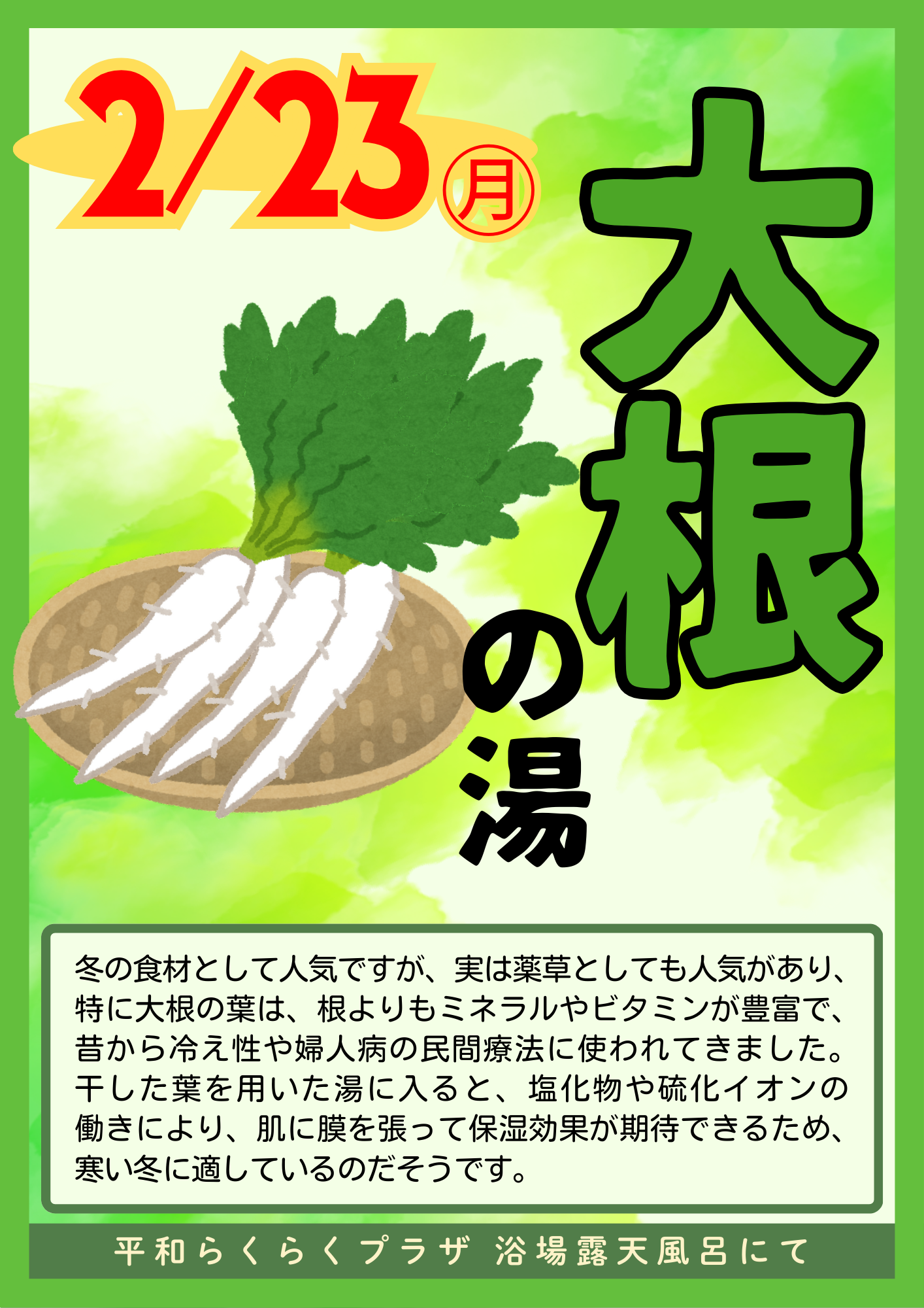 2月の変わり湯は「大根の湯」を実施します♨実は大根は古来より2月の季節湯として、親しまれてきました。大根の葉から出るエキスは、保温・保湿効果が高く、冷え性や神経痛に効果的とされています。ぜひご利用をお待ちしております。※当日は乾燥させた大根の葉を入れます。