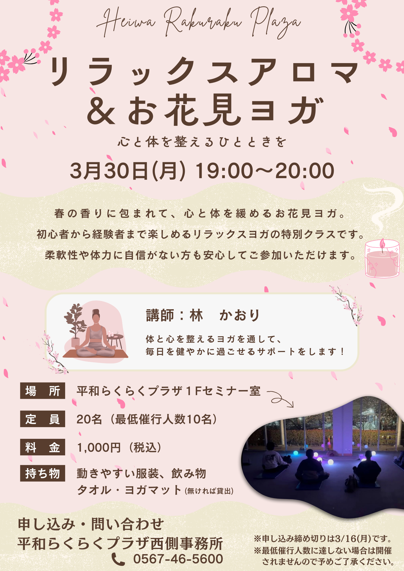 3/30(月)にリラックスアロマ&お花見ヨガを開催します。春の香りに包まれて、心と体をリラックスさせる時間。初心者から経験者の方まで大歓迎です!詳しくは西側事務所までお問い合わせください。たくさんのご参加お待ちしております!