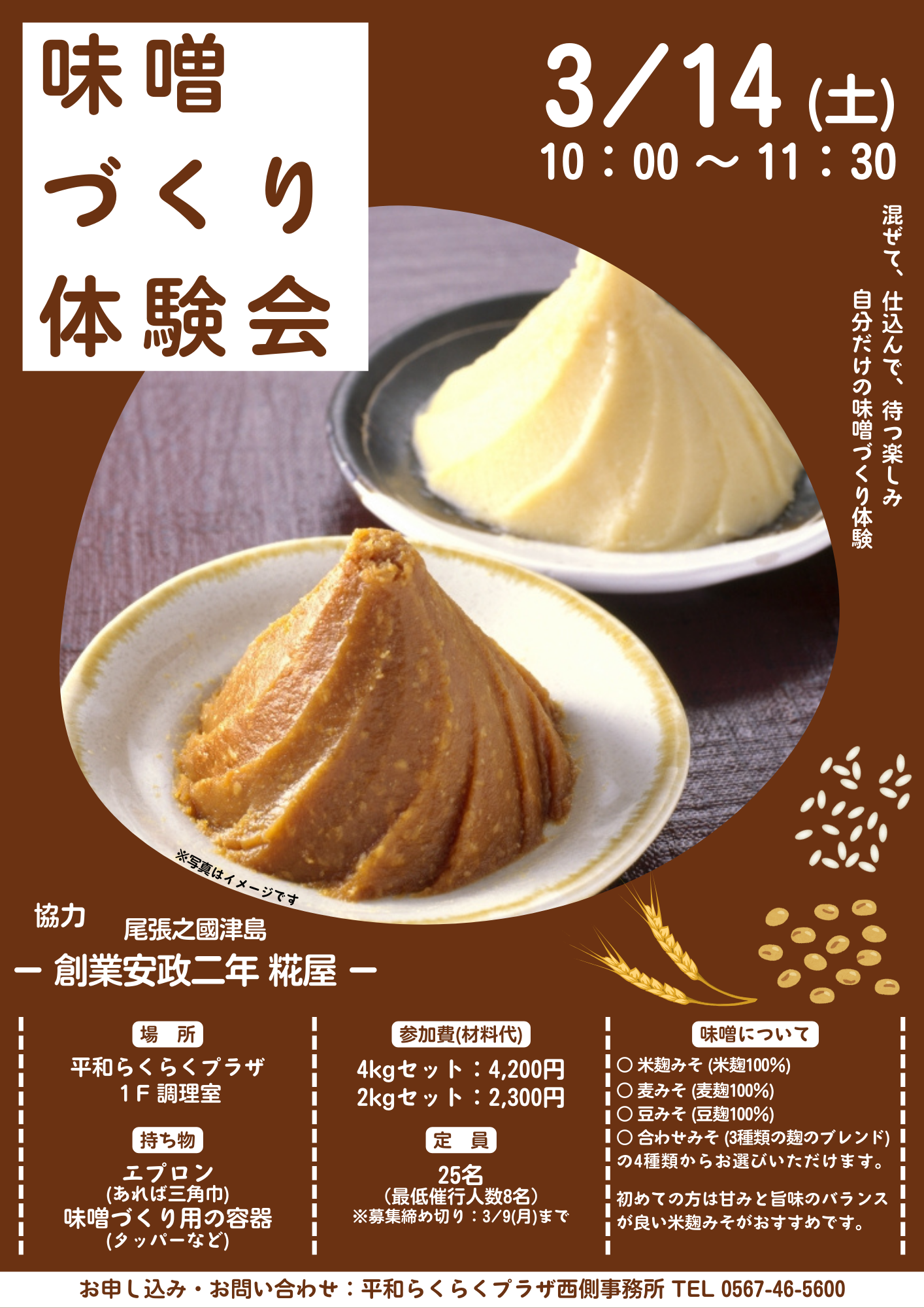 3/14(土)に味噌づくり体験会を開催します!講師に津島市にある糀屋さんをお招きし、本格的な味噌づくり体験を教えていただきます。※味噌づくりに必要な容器(タッパーなど)は各自でご持参ください。募集期間は3/9(月)までとなっております。詳しくは西側事務所までお問い合わせください。たくさんのご参加お待ちしております!