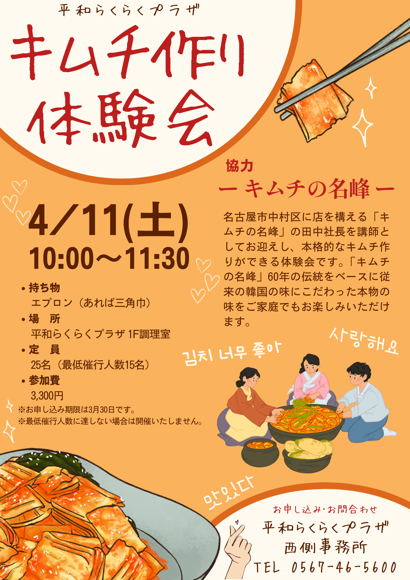 4/11(土)にキムチ作り体験会を開催します!名古屋市中村区に店を構える「キムチの名峰」の田中社長を講師にお迎えし、本格的なキムチ作りができる体験会です!お申し込み期限は3/30(月)までとなっております。詳しいお問い合わせは西側事務所まで!たくさんのご参加お待ちしております!