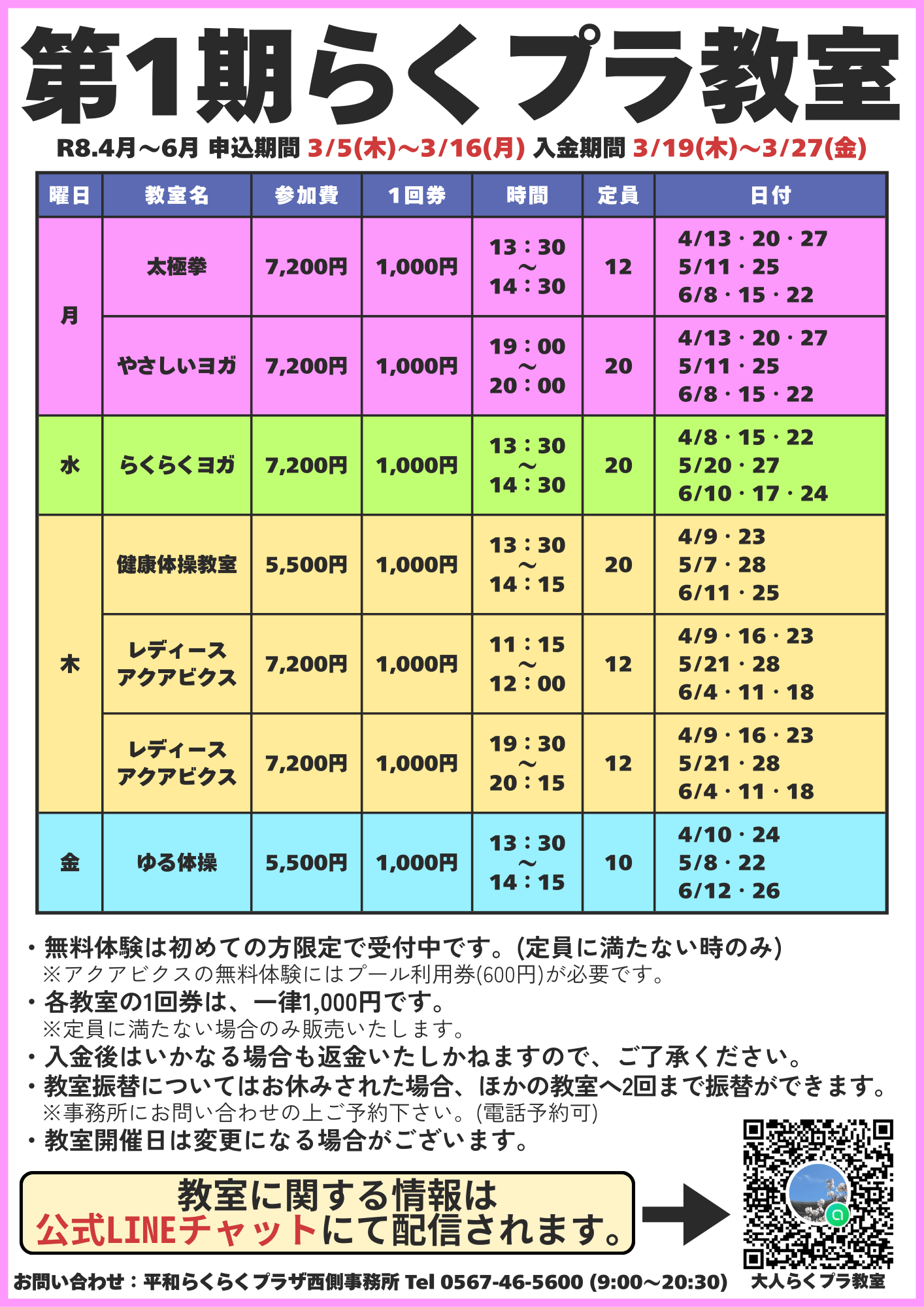 第1期らくプラ教室の日程が決定しました!今期もさまざまな運動教室をご用意しております。どの教室も始めやすい内容ばかりとなっております!また、空きのある教室に関しましては、一回券でのご参加も随時、募集しております。詳しくは、西側事務所までお問い合わせください。たくさんのご参加お待ちしております!