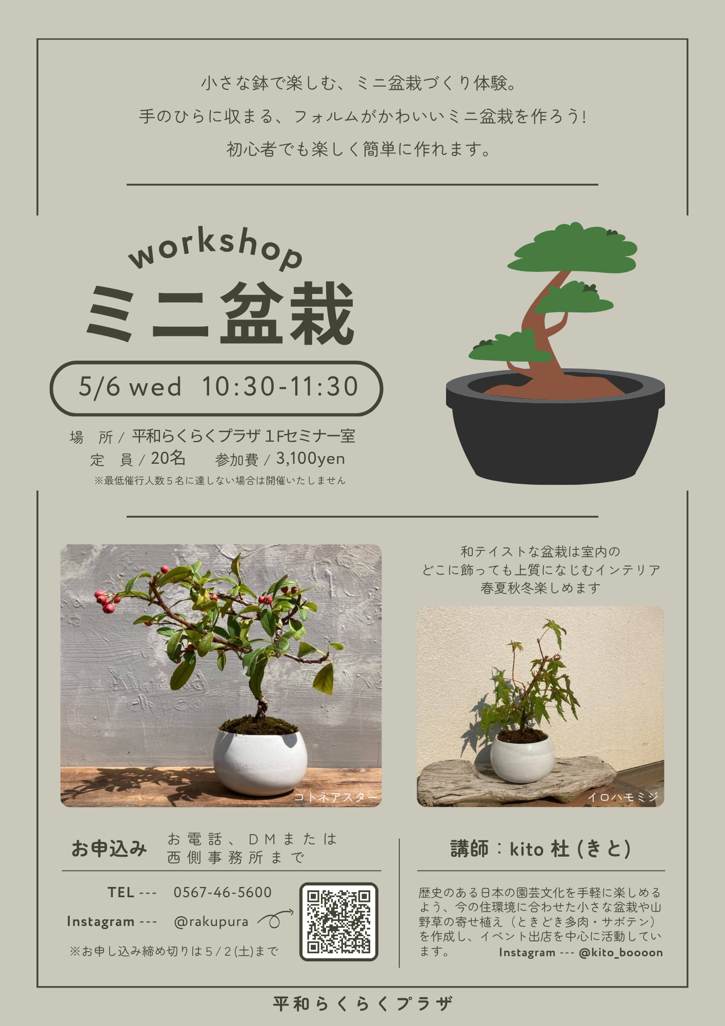 5/6(水)にミニ盆栽教室を開催いたします。講師には kito 杜(きと)さんをお迎えします。手のひらに収まる、フォルムが可愛い自分だけのミニ盆栽を作ってみましょう!申し込み締め切りは、5/2(土)までとなります。詳しいお問い合わせはお電話またはInstagramのDMまで!たくさんのご参加お待ちしております!
